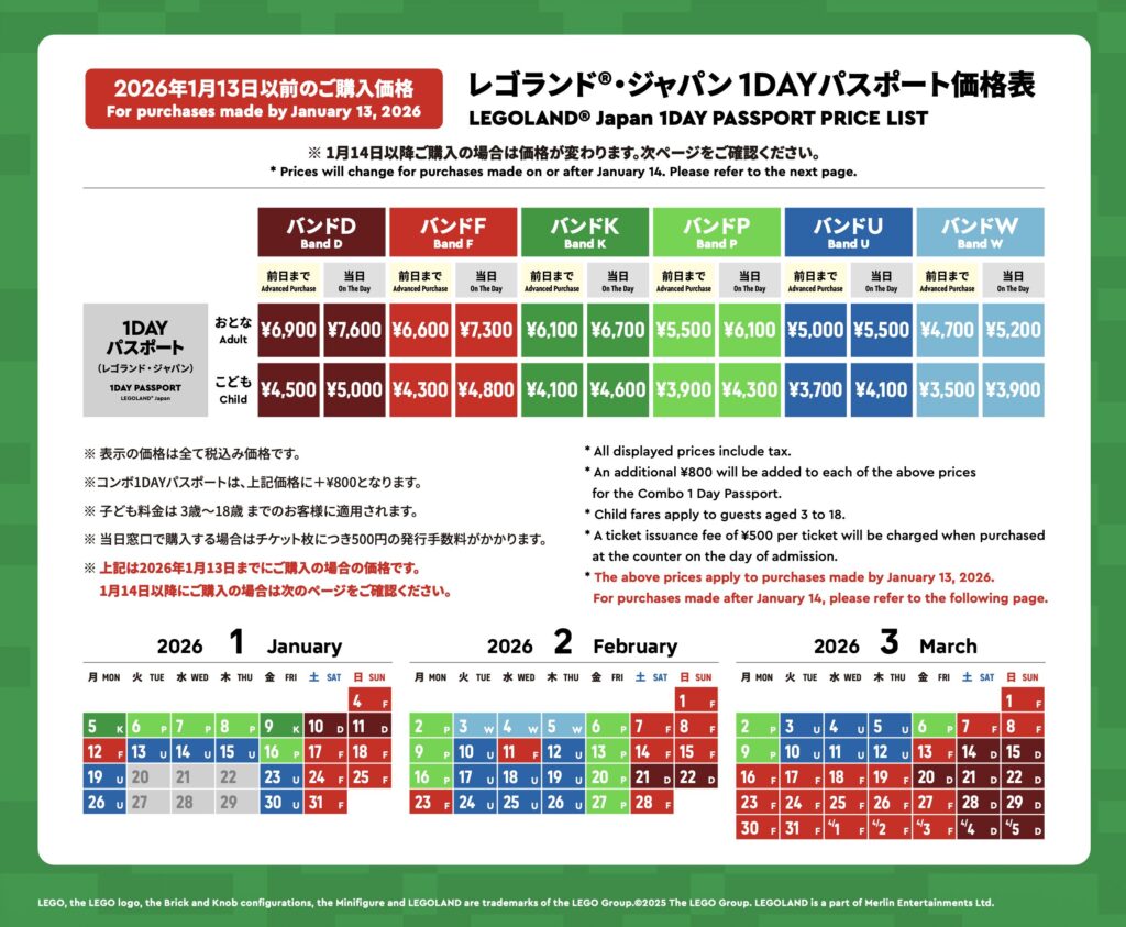 通常、レゴランドのチケットは価格変動制で「繁忙期は高く、閑散期は安い」価格設定です。